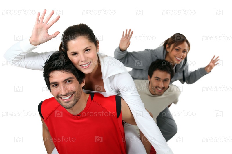 Двое молодых людей держат девушек на спинах