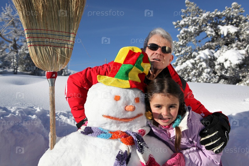 Отец и дочь со снеговиком