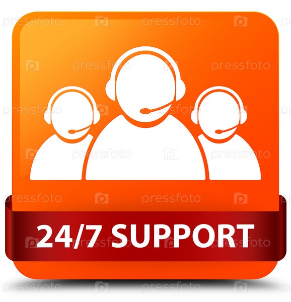 Поддержка 24/7 (икона команды по уходу за клиентами) оранжевая квадратная кнопка красная лента посередине