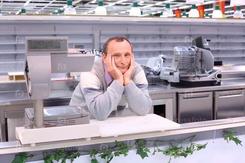 Скучающий продавец в магазине с пустыми полками