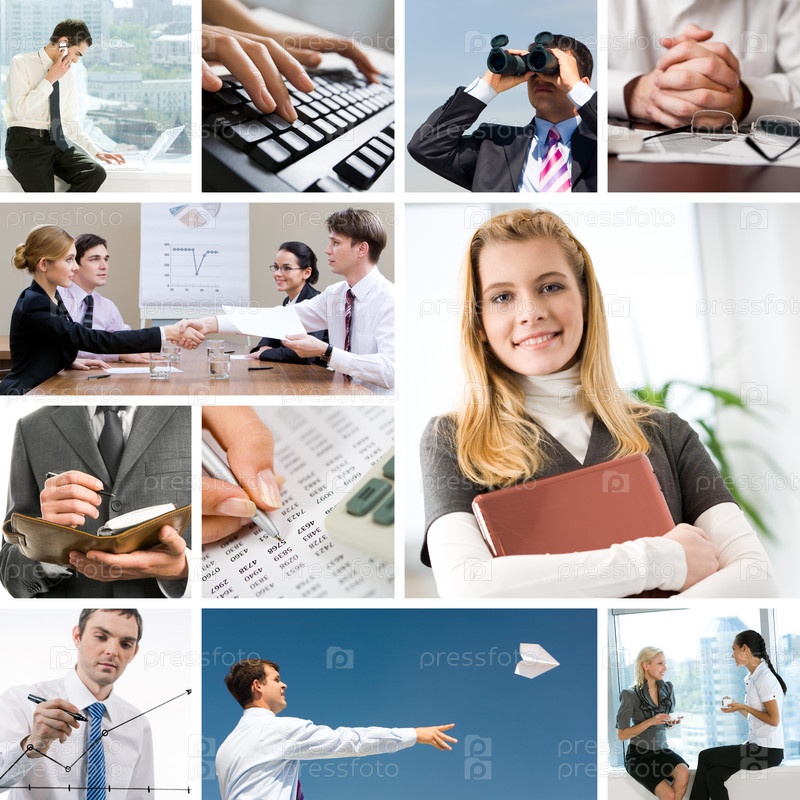 Коллаж с деловыми людьми и объектами в разных ситуациях