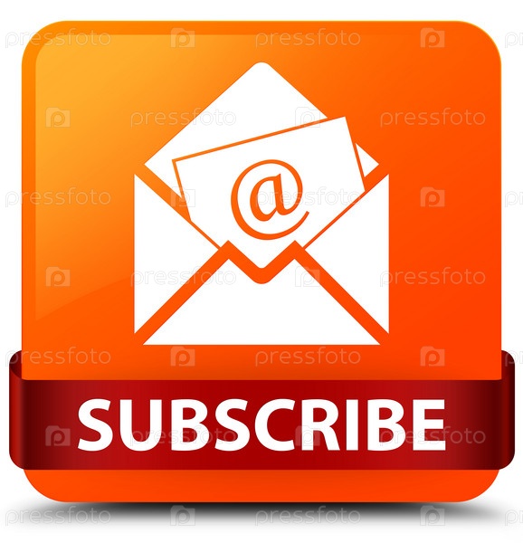 Подписаться (икона электронной почты для рассылки новостей) оранжевая квадратная кнопка красная лента посередине