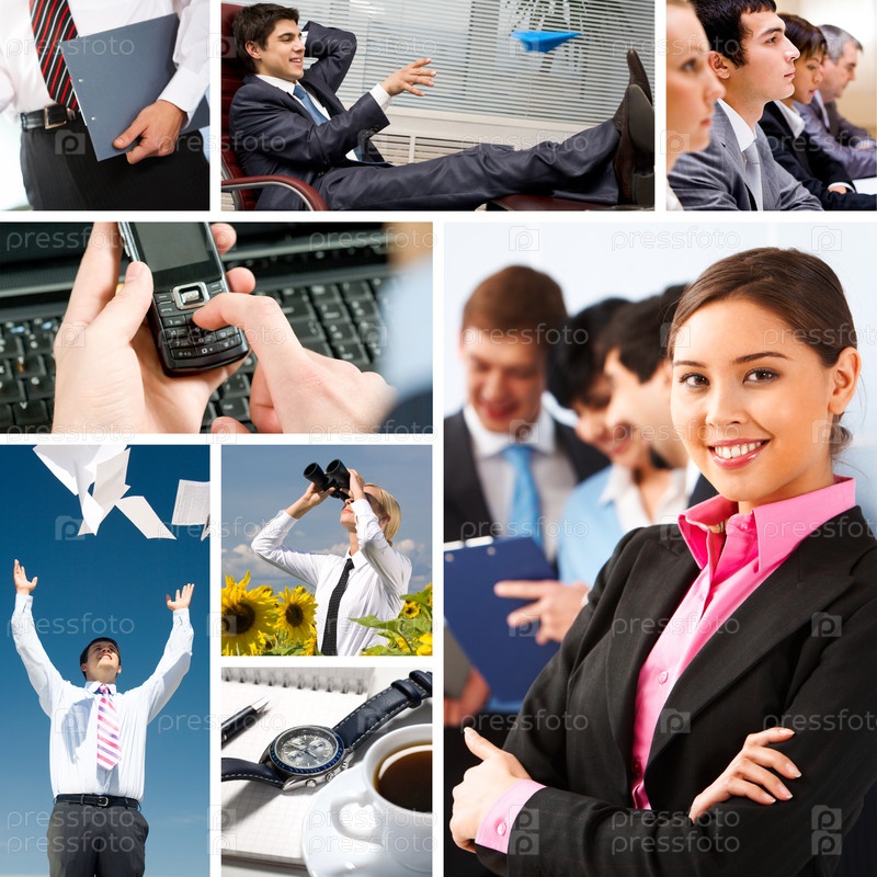 Коллаж с деловыми людьми и объектами в разных ситуациях