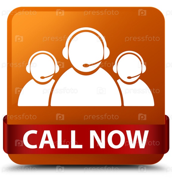 Call now (икона команды по обслуживанию клиентов) коричневая квадратная кнопка красная лента посередине