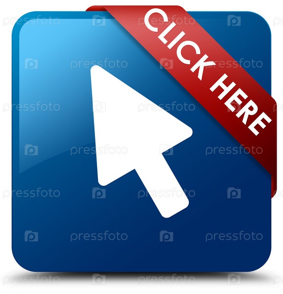 Нажмите здесь синий квадратный кнопка красная лента в углу