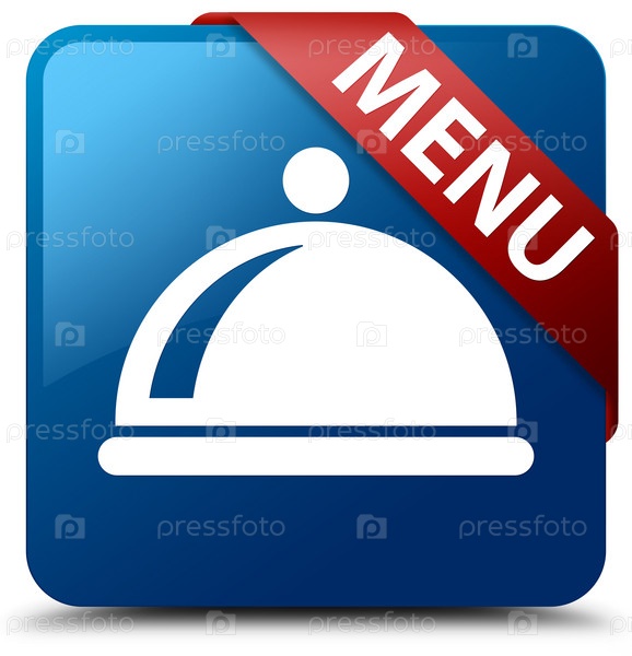 Меню (икона блюда) синяя квадратная кнопка красная лента в углу