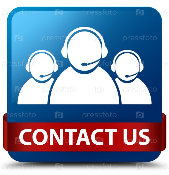 Свяжитесь с нами (икона команды по обслуживанию клиентов) синяя квадратная кнопка красная лента посередине