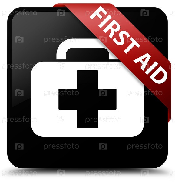 Первая помощь черная квадратная кнопка красная лента в углу
