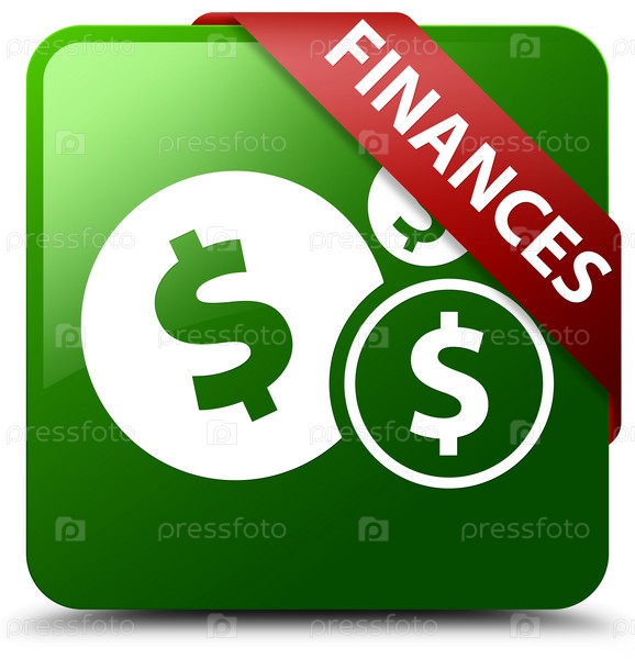 Финансы (знак доллара) зеленая квадратная кнопка красная лента в углу