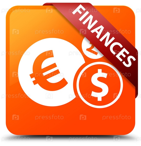 Финансы (знак евро) оранжевая квадратная кнопка красная лента в углу