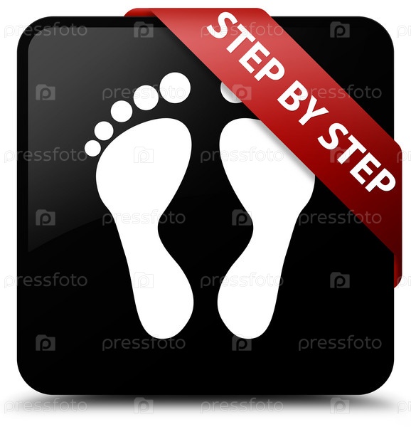 Шаг за шагом (икона отпечатков) черная квадратная кнопка красная лента в углу