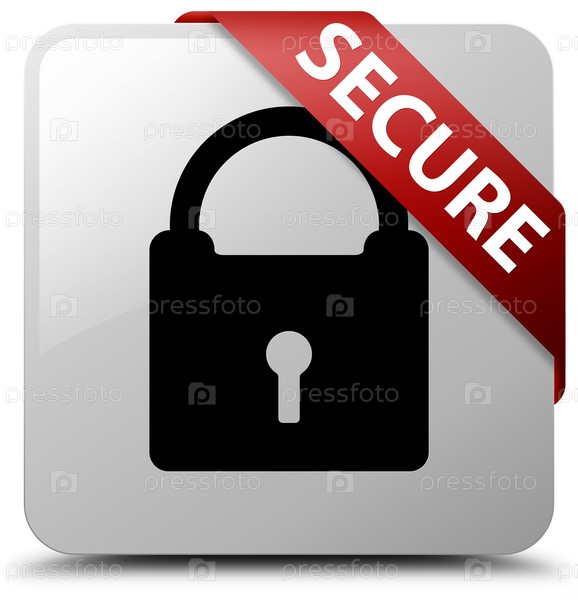 Безопасно (икона замка) белая квадратная кнопка красная лента в углу