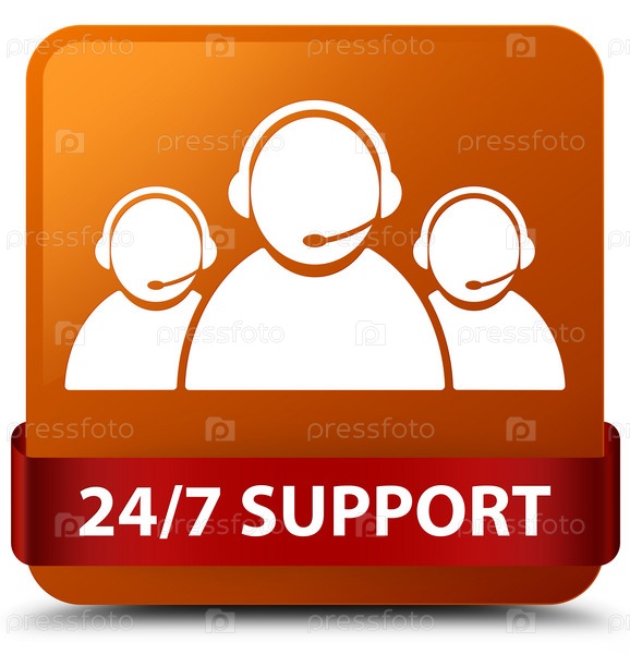 Поддержка 24/7 (икона команды по уходу за клиентами) коричневая квадратная кнопка красная лента посередине