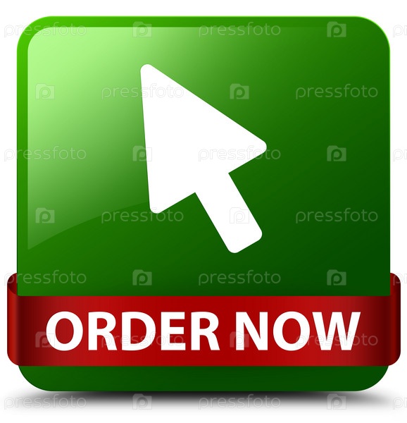 Заказать сейчас (икона курсора) зеленая квадратная кнопка красная лента посередине