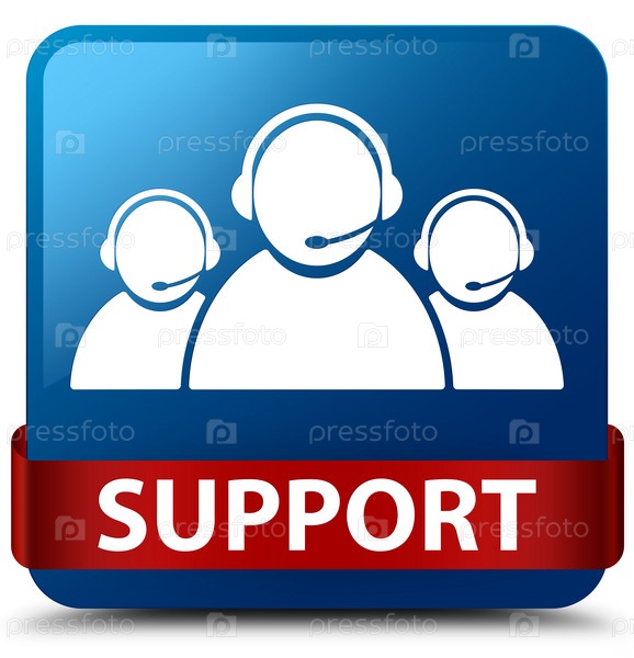 Поддержка (икона команды по обслуживанию клиентов) синяя квадратная кнопка красная лента посередине