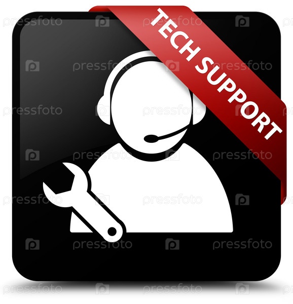 Техническая поддержка черная квадратная кнопка красная лента в углу