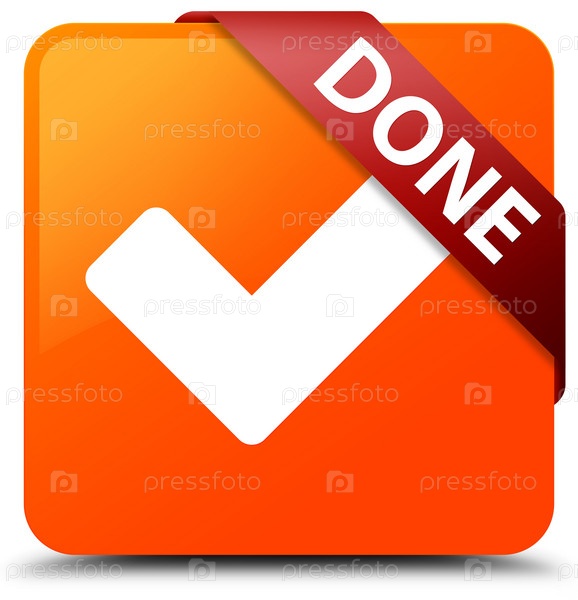 Сделано (икона проверки) оранжевая квадратная кнопка красная лента в углу