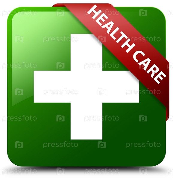 Здравоохранение (знак плюс) зеленая квадратная кнопка красная лента в углу