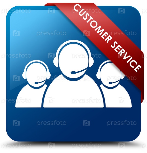 Служба поддержки клиентов (икона команды) синяя квадратная кнопка красная лента в углу