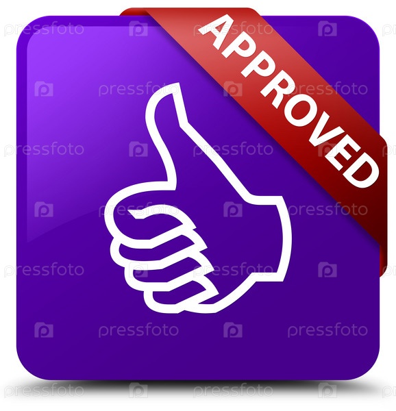 Утверждено (икона пальцев вверх) фиолетовая квадратная кнопка красная лента в углу