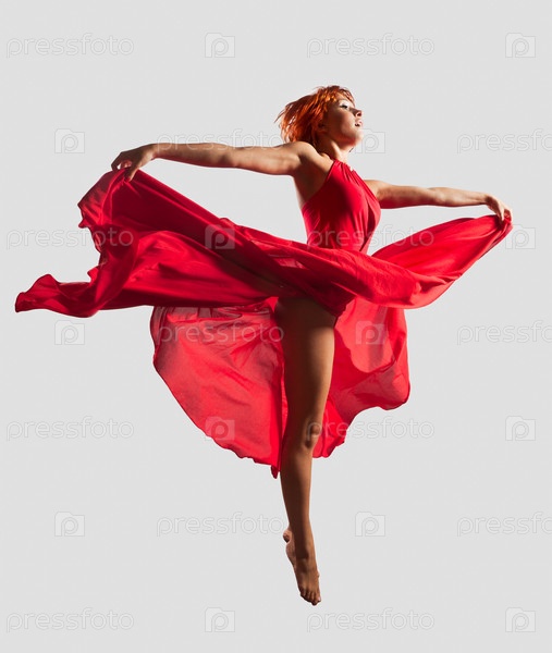 Молодая танцовщица парит в красном платье