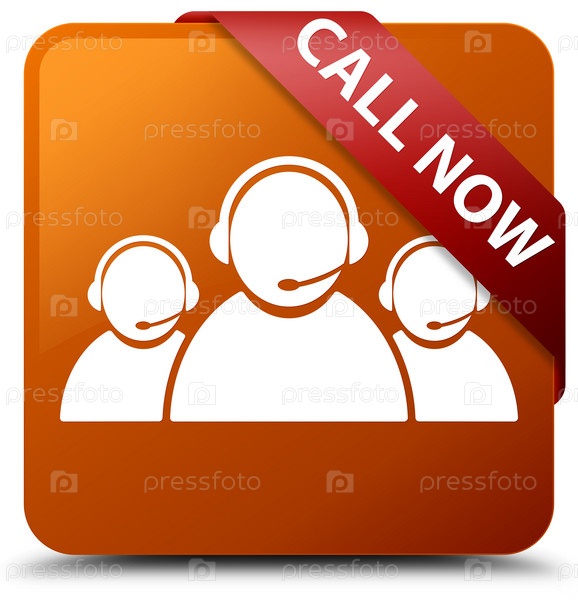 Call now (икона команды по обслуживанию клиентов) коричневая квадратная кнопка красная лента в углу