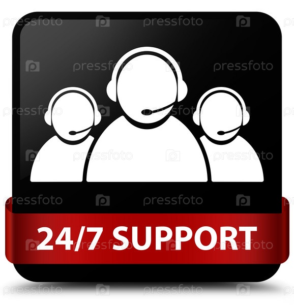Поддержка 24/7 (икона команды по уходу за клиентами) черная квадратная кнопка красная лента посередине