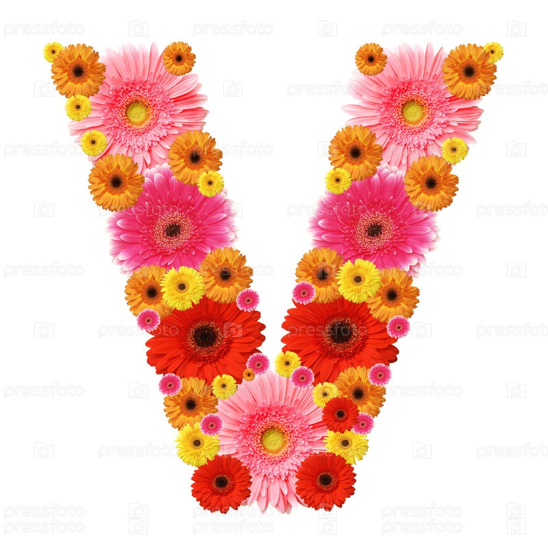 Буква V из разноцветных цветов герберы, выделенных на белом фоне