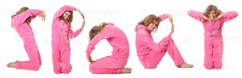 Девочка в розовом костюме показывает слово 'СПОРТ'