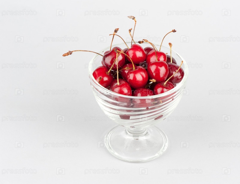 Свежие красные вишни в стеклянной креманке