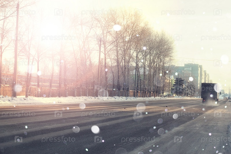 Городская дорога с автомобилем в зимний закат