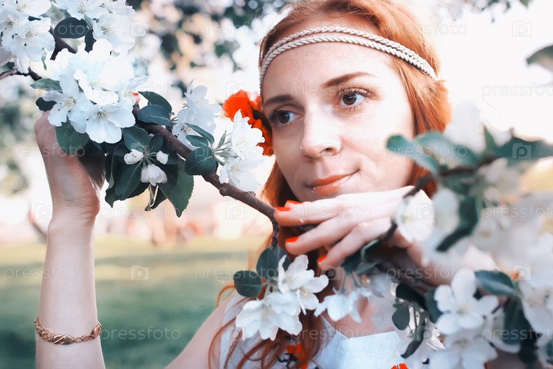 Лицо девушки в ветке яблочного цветка