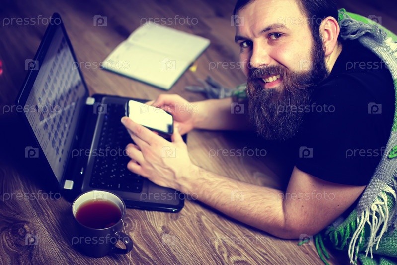 Бородатый красивый мужчина лежит на полу, завернут в ковры и работает с ноутбуком