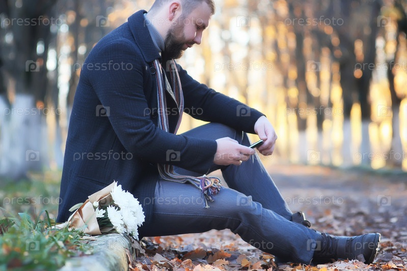 Мужчина осенью парк на открытом воздухе с букетом цветов