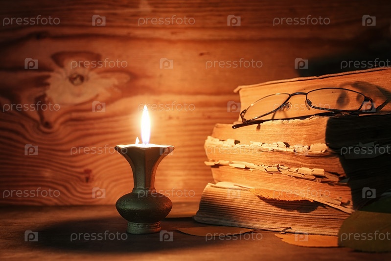 Старая порванная книга на деревянном столе, зажженные свечи и очки