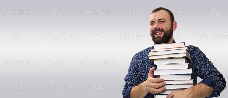Студент взрослый бородатый мужчина со стопкой книг