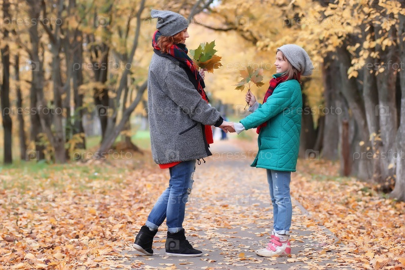 Семейная женщина и дочь гуляют осенним парком