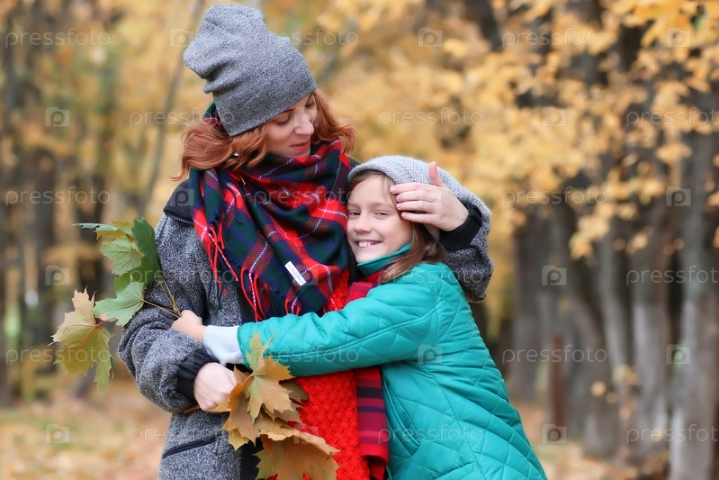 Семейная женщина и дочь гуляют осенним парком
