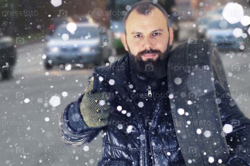 Мужчина меняет колеса шин зимой