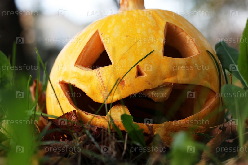 Вырезанная тыква Хэллоуина на газоне