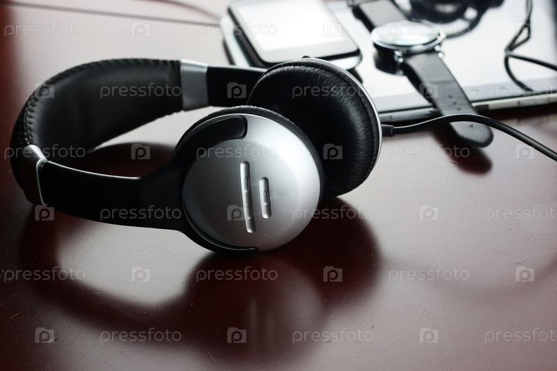 Наушники на столе рядом с планшетом и часами