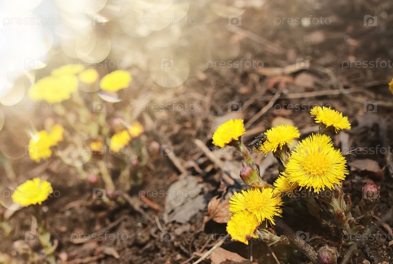 Весенние желтые цветы в упавших листьях