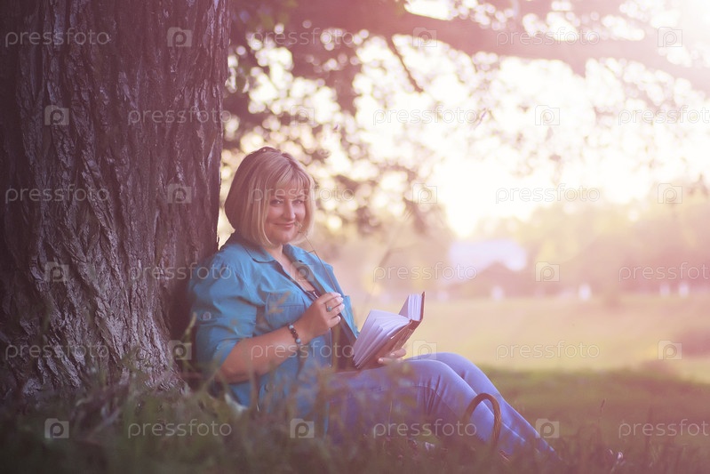 Женщина в парке на закате с книгой