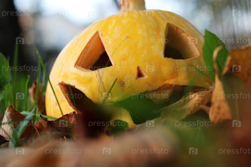 Вырезанная тыква Хэллоуина на газоне