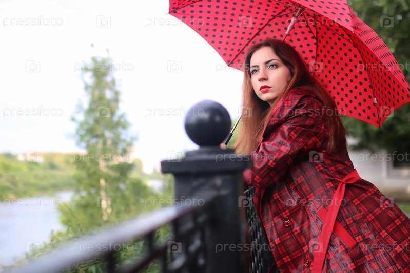 Женщина с красным зонтиком на уличном дереве