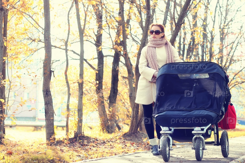 Мать в парковой коляске осенью
