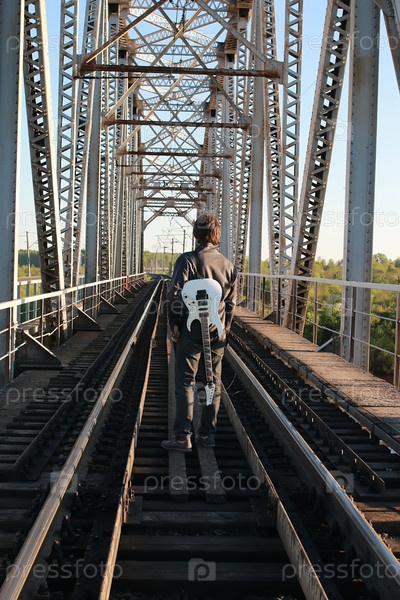 Человек с гитарой на железной дороге