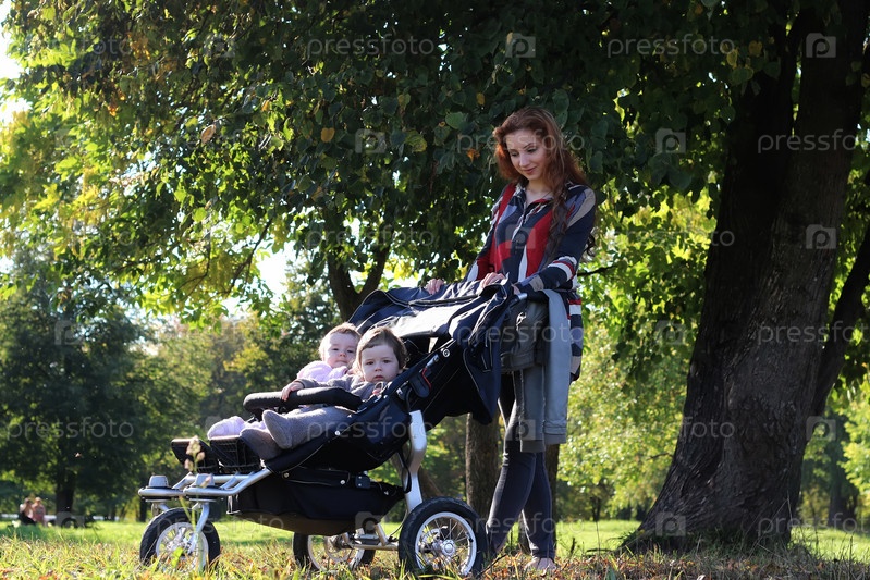 Женщины ходят на детской коляске летом