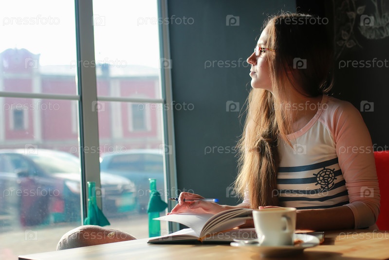 Девушка в кафе за чашкой кофе с блокнотом