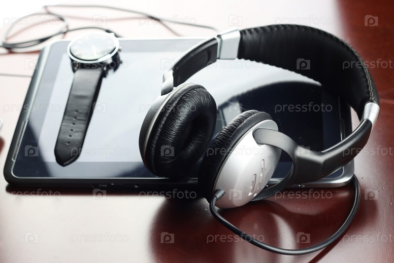 Наушники на столе рядом с планшетом и часами